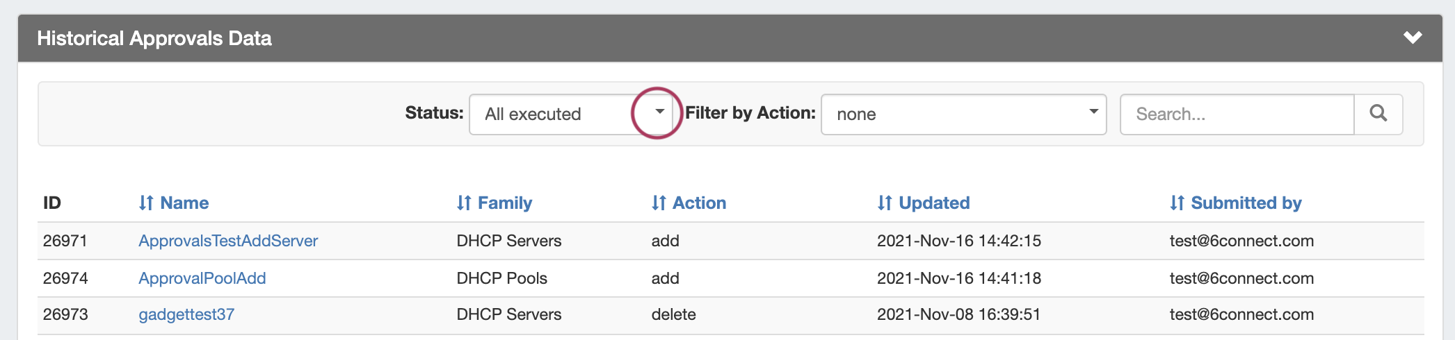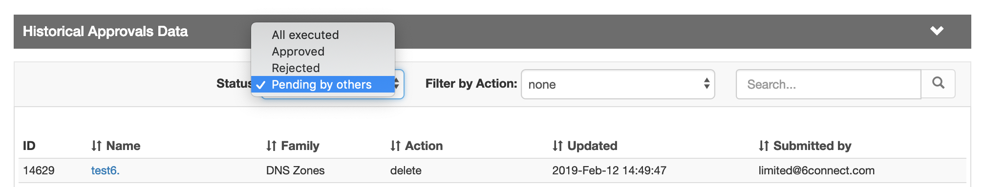 Similar to the Pending Approvals list, it may be sorted ascending / descending by field, filtered by status, filtered by action, or searched by name.