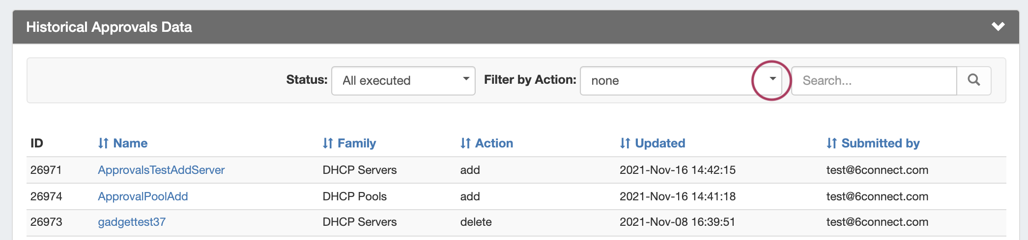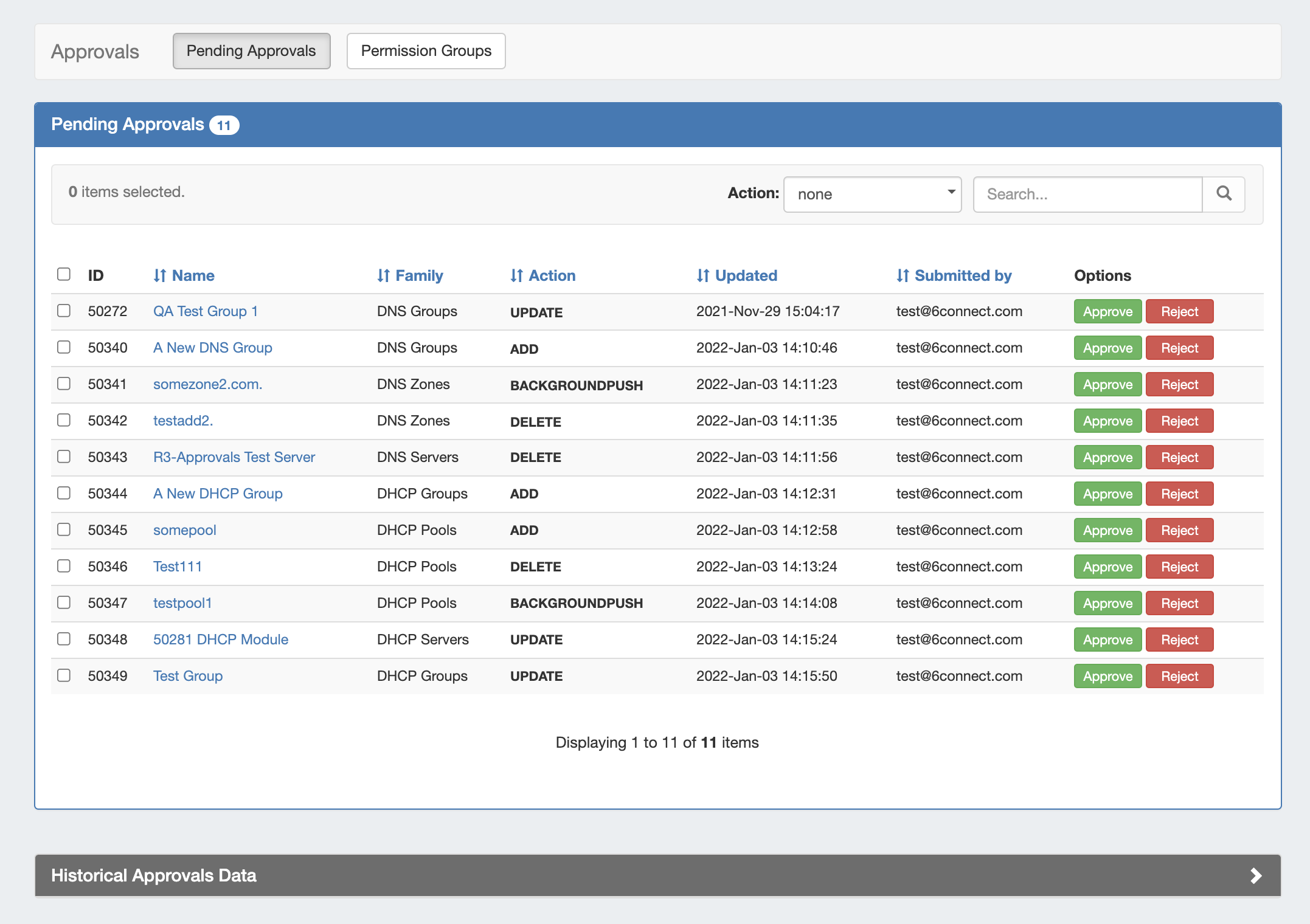 Currently, Approvals is available only for DNS / DHCP related actions, while we gather feedback and use cases to inform possible future updates. If you are interested in providing feedback, a use case, or requests for future additions to the Approvals system, please contact feedback@6connect.com.