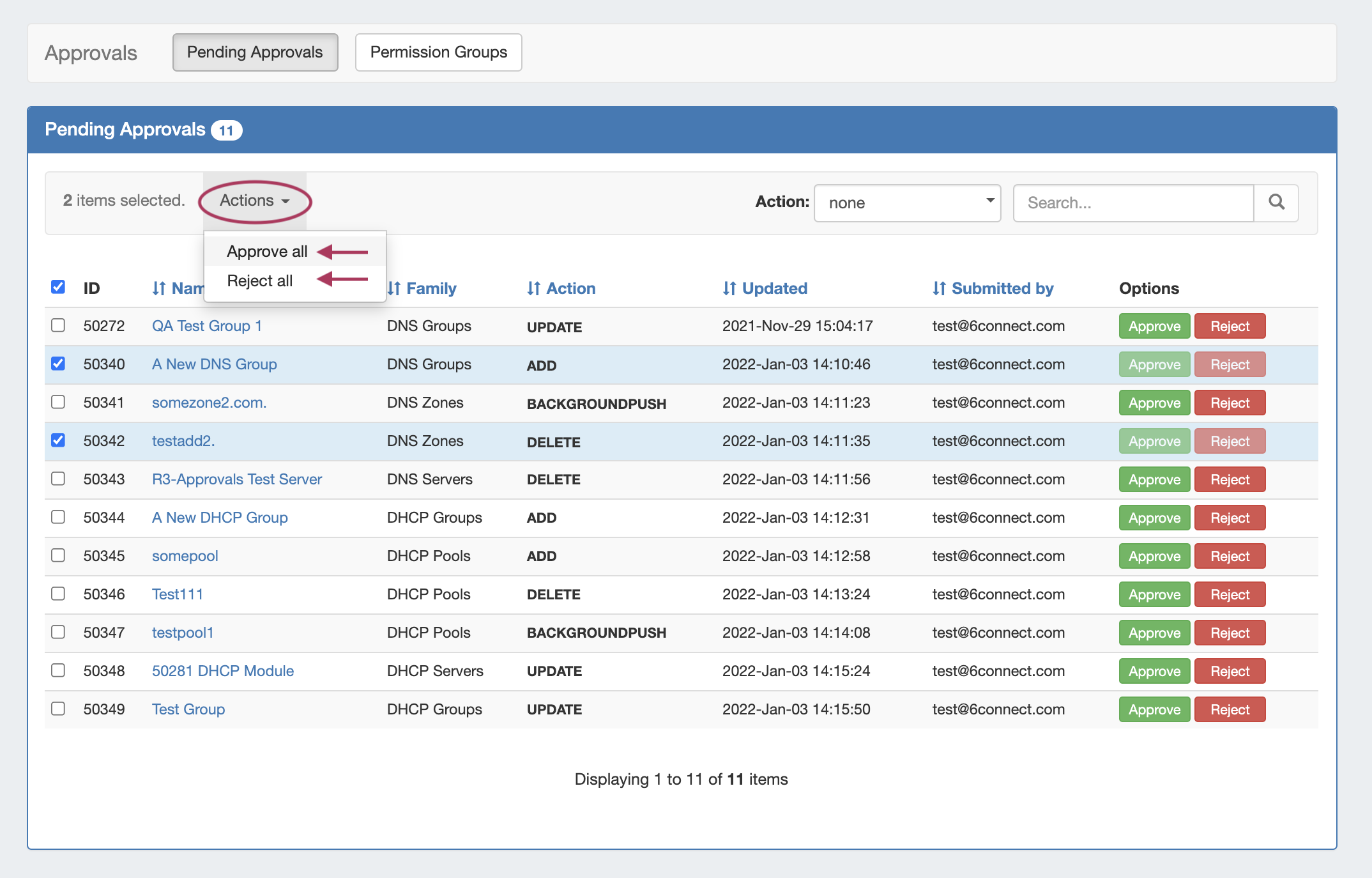 Approving and Rejecting change requests may be done individually, or in bulk by selecting multiple item checkboxes, expanding the "Actions" menu at the top of the list, and then selecting to Approve or Reject all selected items. If notifications are enabled for the Group or Action, an email will be sent notifying the request submitter of the status change.