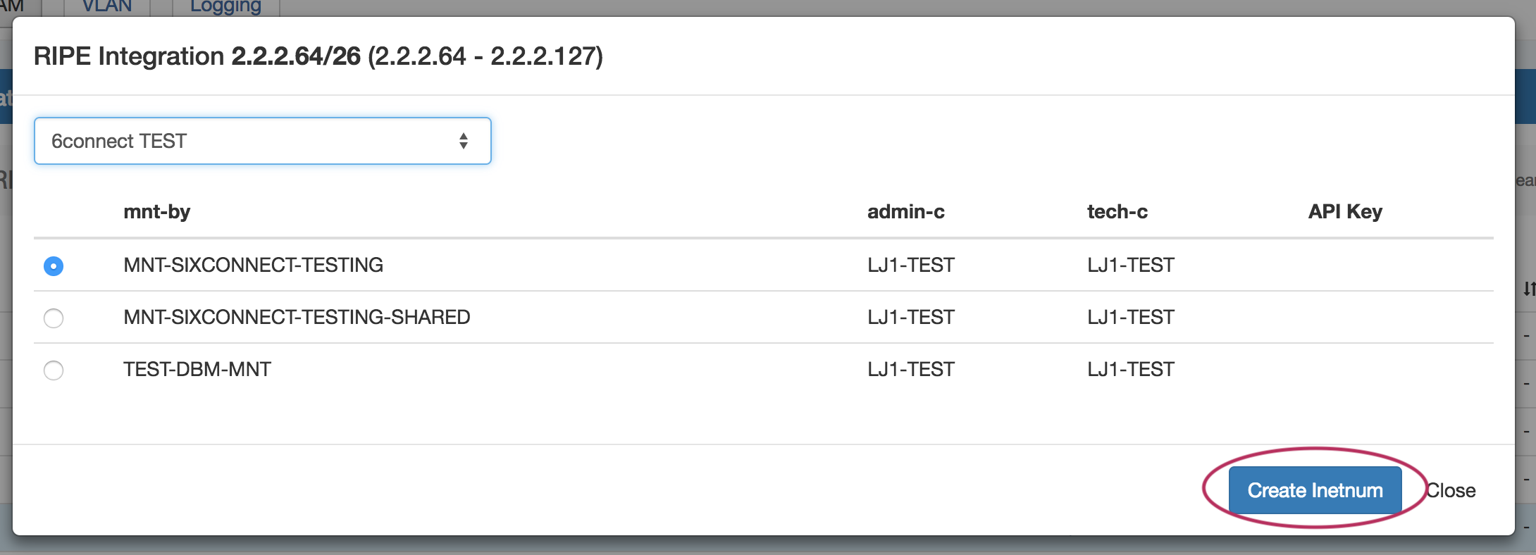 Identify which LIR data you want to use for the netnum update, and select either "Create Inetnum" or "Close" to exit.