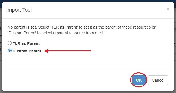 After initiating the import, a dialog box will ask if you would like to assign TLR as the parent resource for the imported items - if so, click "OK".