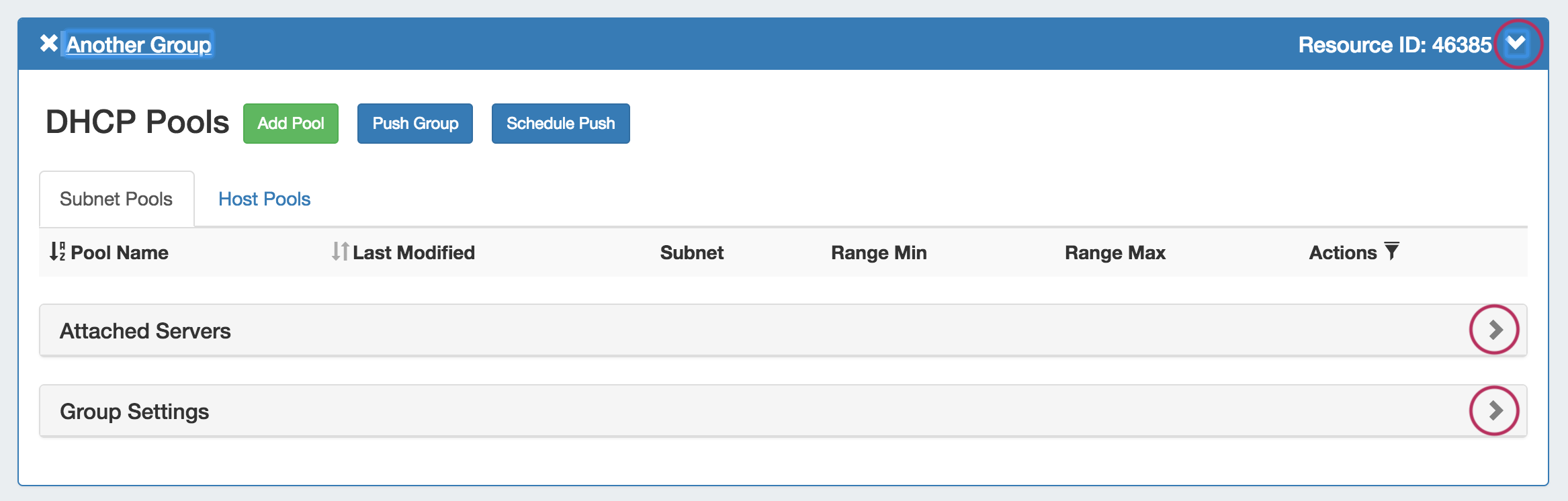 DHCP groups allow for organizing multiple pools together and linking those pools with one or more servers. Pools may be pushed individually, as a group, or at the server level.