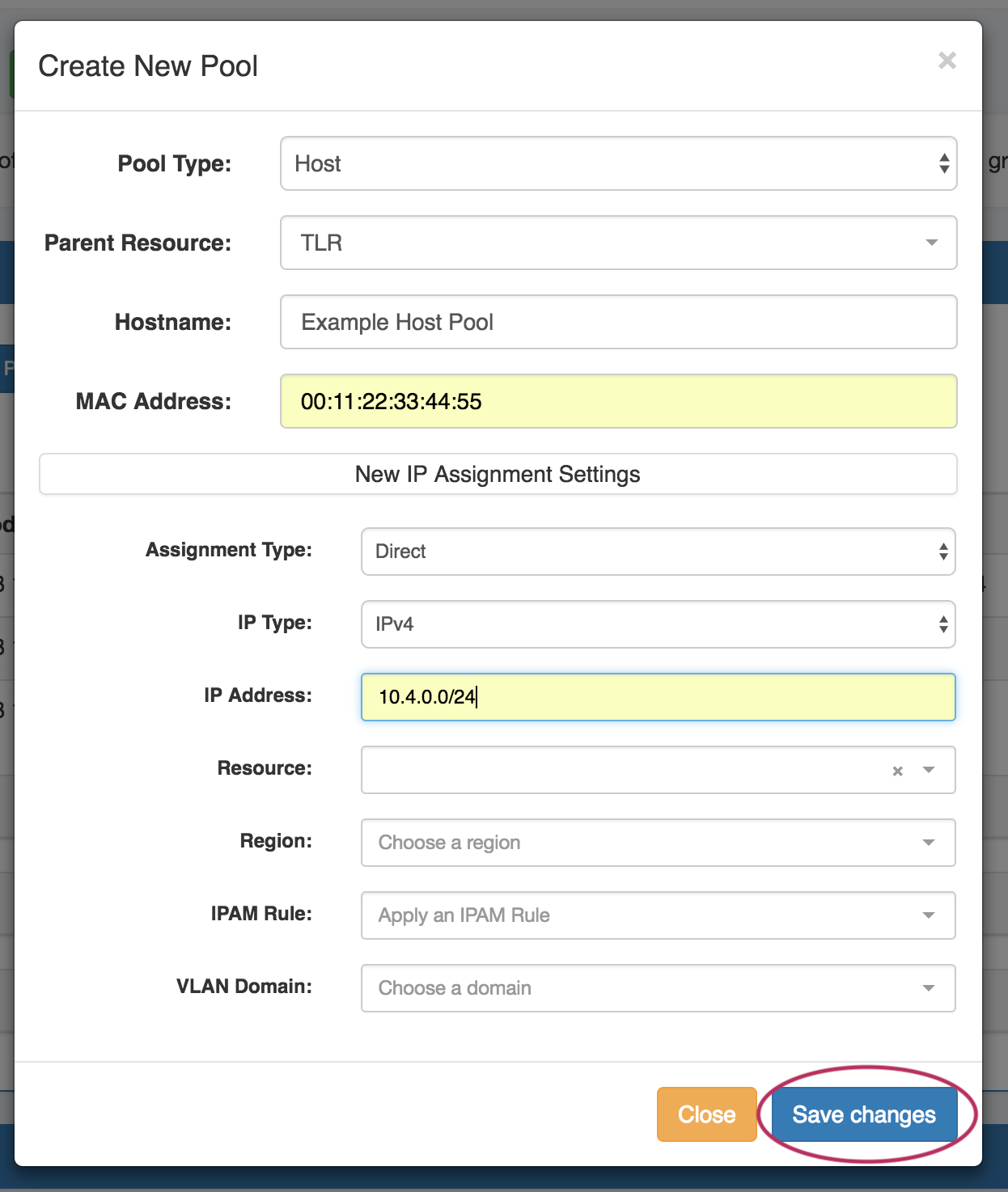 When the "Create New Pool" dialog appears, you may choose to create either a Subnet or Host Pool. Either pool type may have a block smart assigned or manually direct assigned.