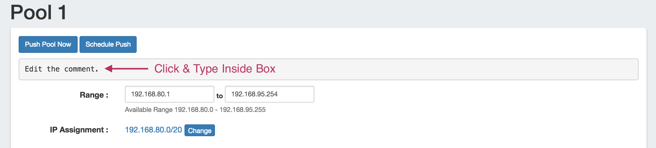 To change the current IP assignment for the pool, click the "Change" button next to "IP Assignment".