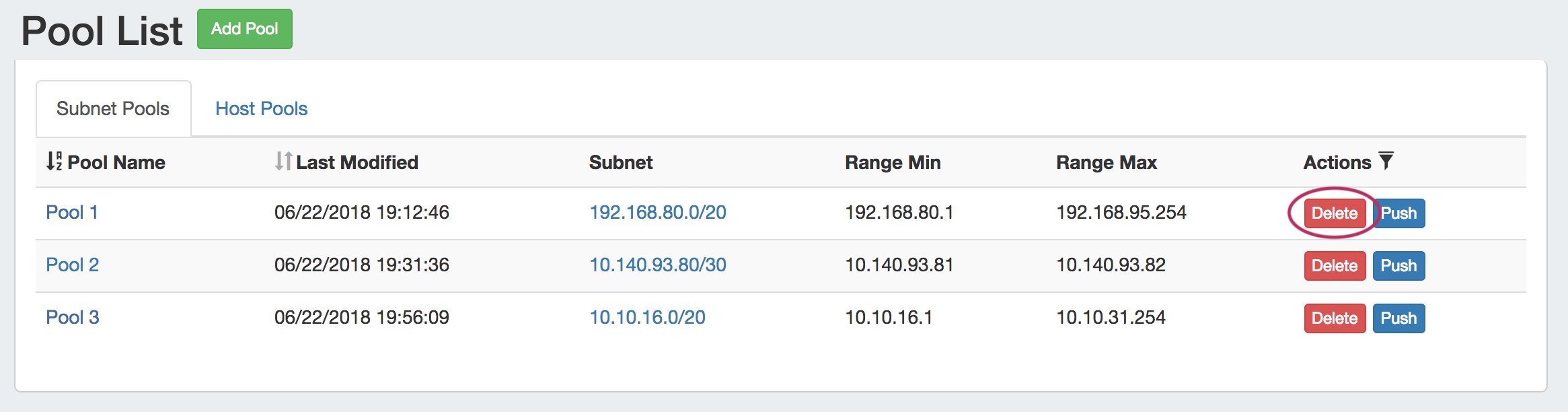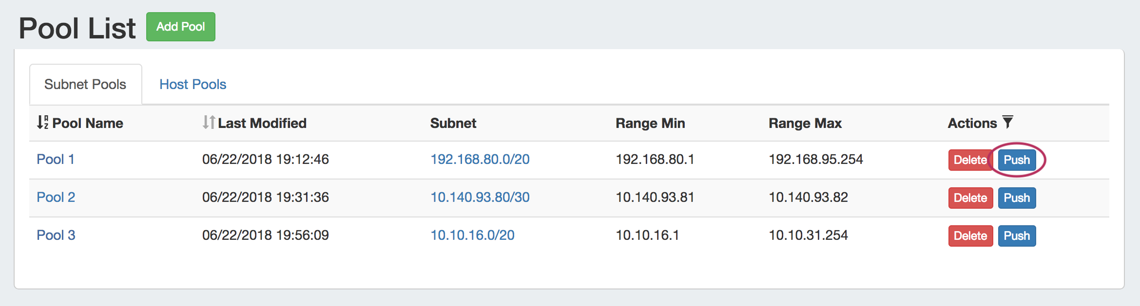 From this page, you may create, view, edit, and push subnet or host pools.