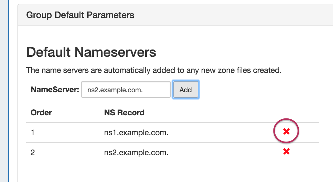 Important - to ensure that your changes are saved while working in Group Default Parameter, click the "Save Group Defaults" button under the Default SOA Values section - this save button will save any changes made to Advanced Settings, Default Nameservers, or Default SOA Settings.