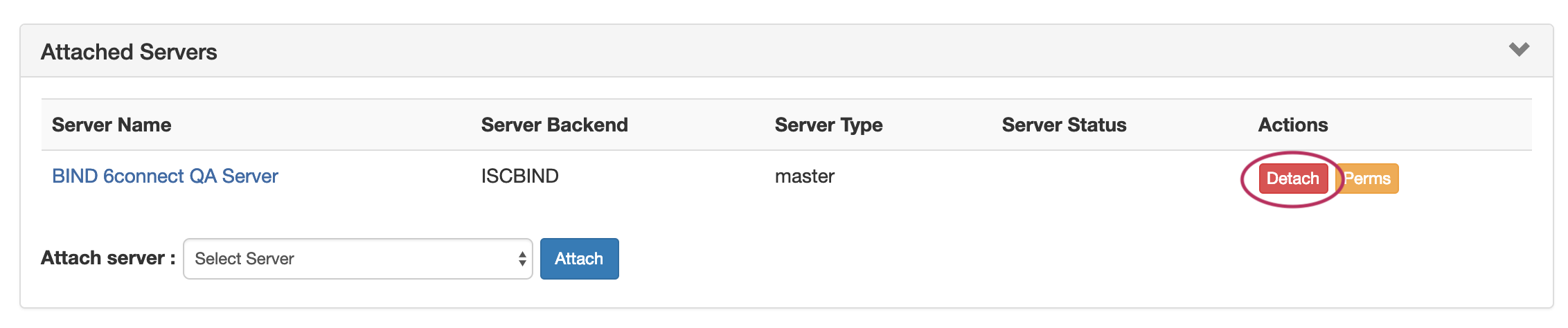 - Under "Attached Servers", verify that the correct server is attached to the DNS group.