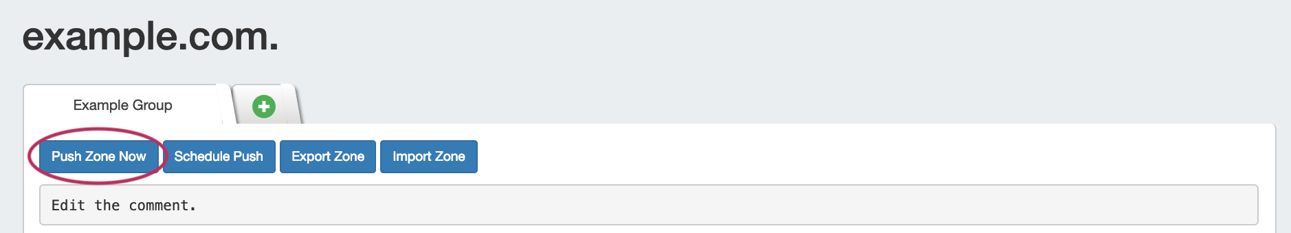 To immediately push a single zone, navigate to the DNS group the zone is under, then click the "Push" button in the Actions column for the zone.
