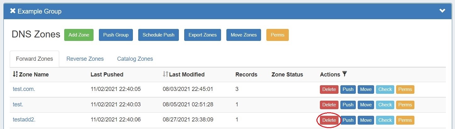 Users with resource delete permissions over the zone may delete a zone record by clicking the "Delete" button under "Actions" for the desired zone entry in any Zone List.