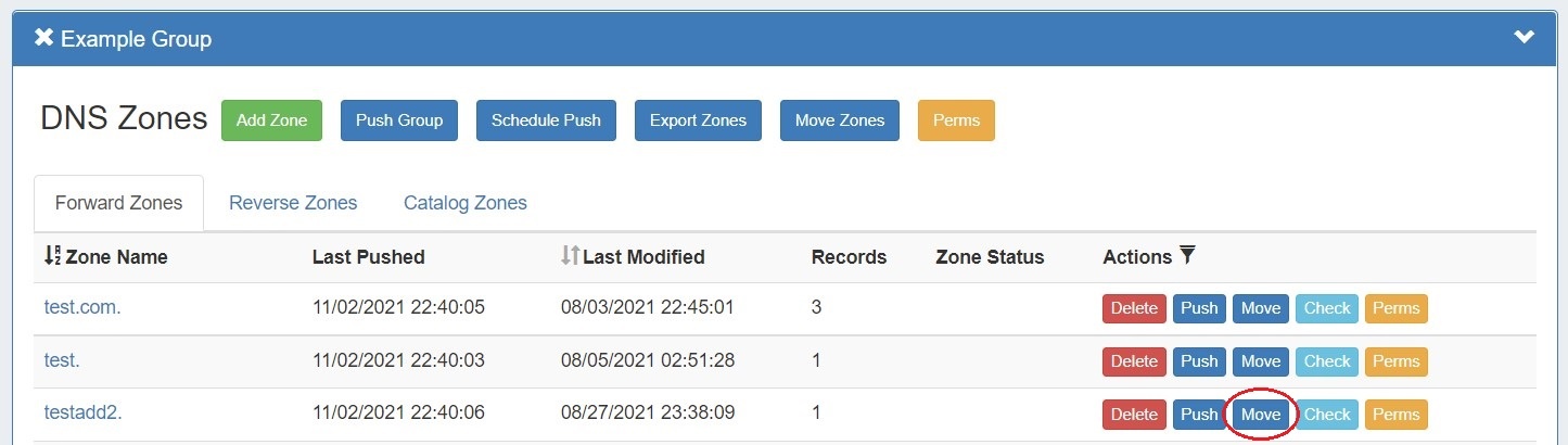 To move a single zone, navigate to the DNS group the zone is under, then click the "Move" button in the Actions column for the zone.