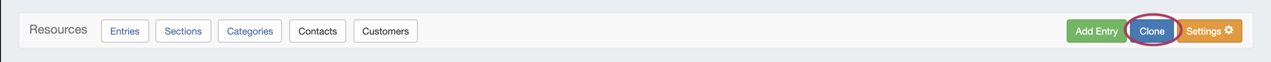 You may also select "Clone" from the bottom of a resource entry page, in which case the entry page you clicked "Clone" from will be automatically selected as the resource to clone.