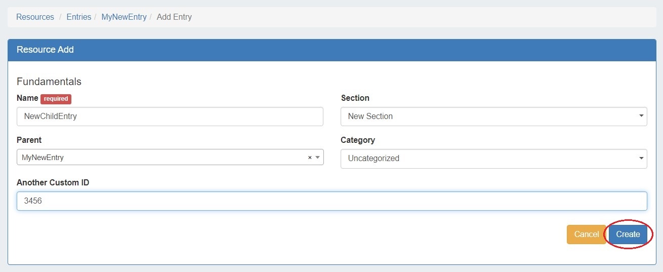 Fill in the Name of your new resource entry, select a section (the chosen section determines what gadgets will show on your new resource's entry page), the parent resource, category, and enter a Custom ID number if desired.