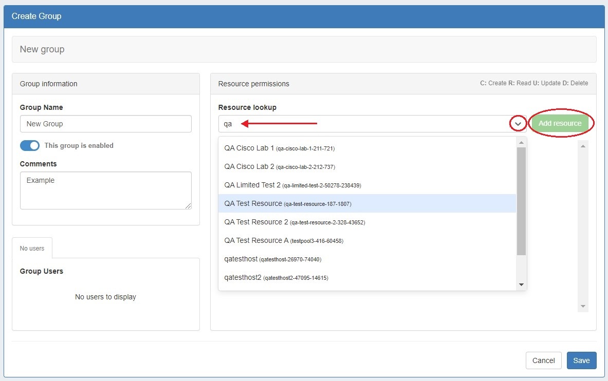 In the example below, we make a group called "Some Example Group", whose users we want to be able to access two resources: An Example Resource, and An Example Resource 2.
