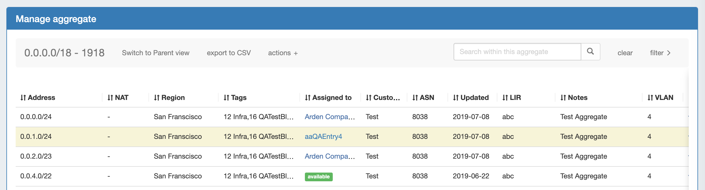 This will open IPAM Manage for all blocks in ProVision, with all the same filters, block edit functions, and search capabilities as in 'standard' IPAM Manage for an aggregate, but with no aggregate-level actions available.