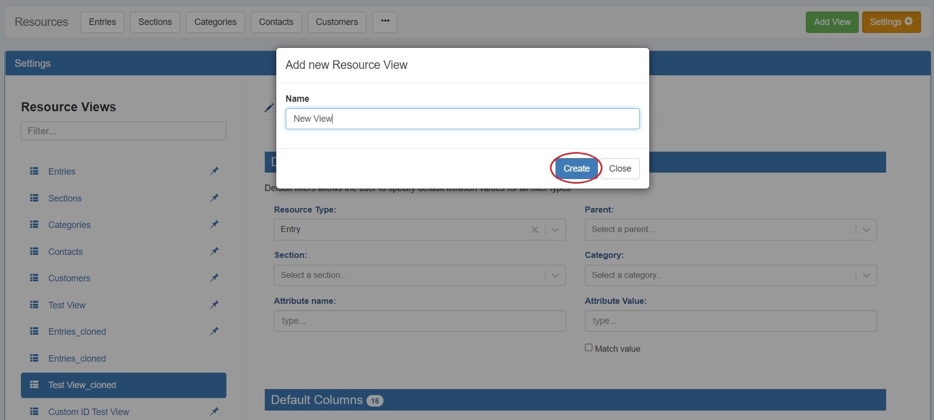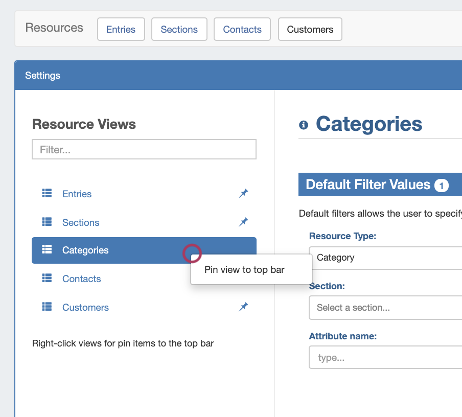 Five resource view lists are provided by default, including "Entries", "Sections", "Categories", "Contacts", and "Customers", and users may either edit the provided views or create additional custom views from variety of filter and attribute column options.