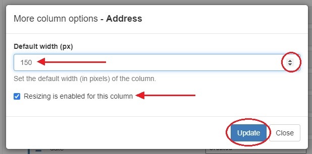 This opens the "More Options" box. From here, you can set a specific default pixel width for the column, or enable/disable drag resizing in the field view.
