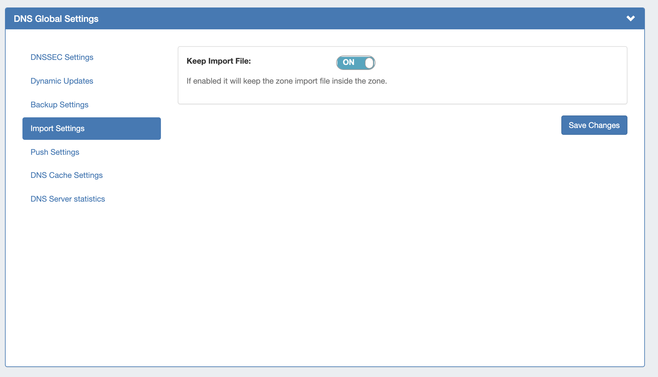 Keep Import File: Saves DNS zone import files to the zone's "Zone Backups and Attached Files" area, for later download. Optional.