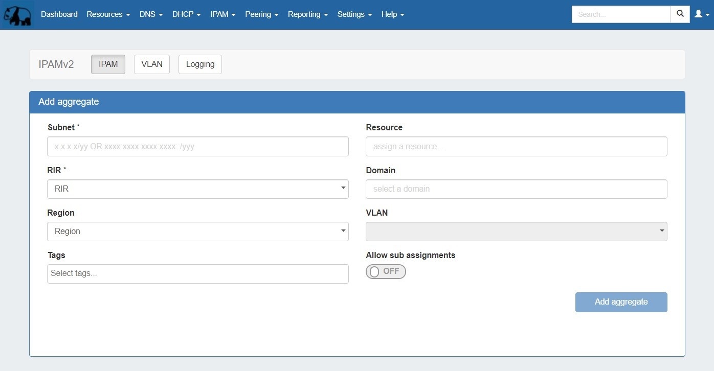 - Enable / Disable Sparse Allocation (IPv6 only): Enable or disable Sparse Allocation for an IPv6 aggregate. Enabling will automatically generate a Numbering Authority Sparse Allocate Domain for use with the aggregate.
