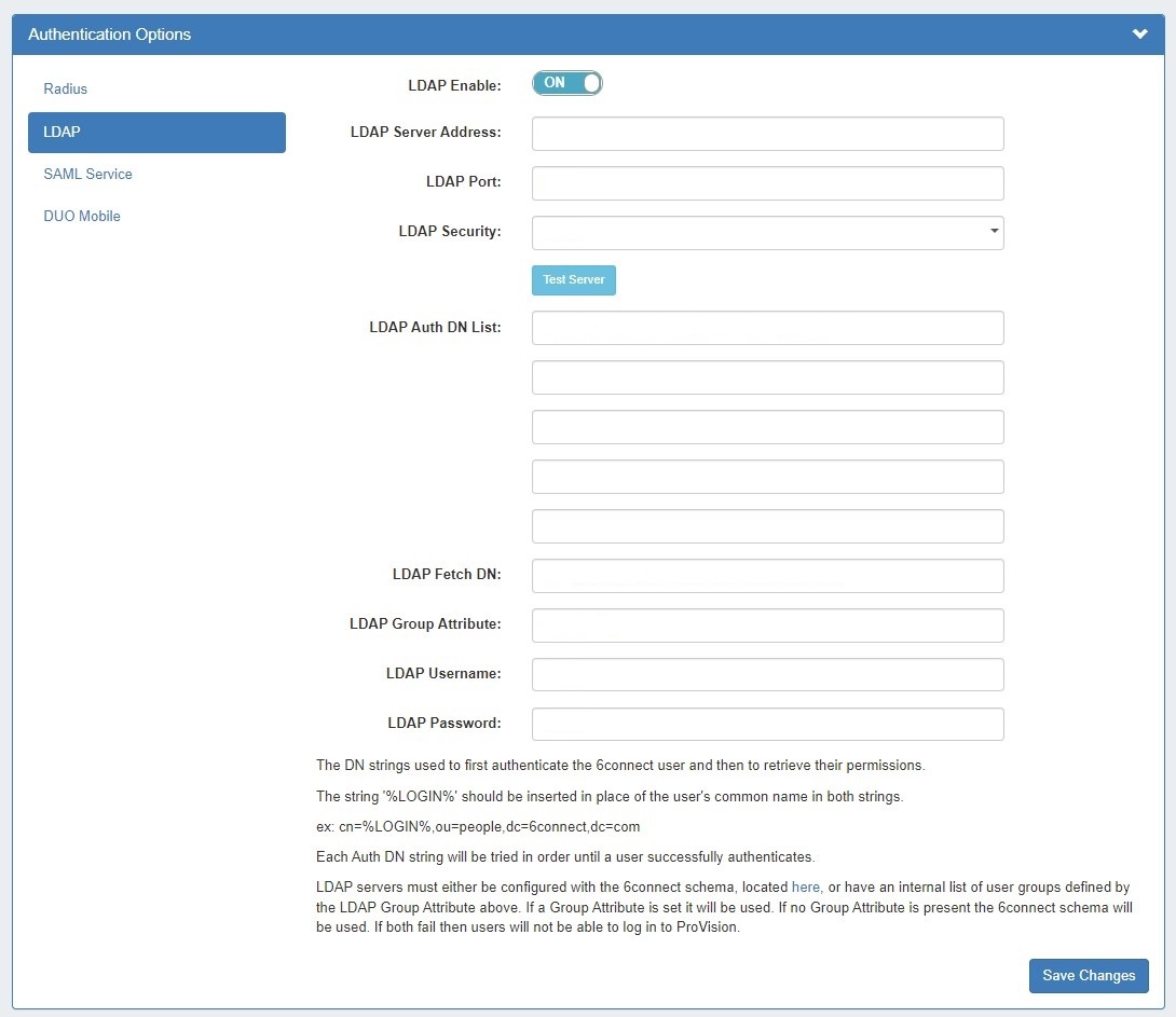 • LDAP Auth DN/Fetch DN: These strings are used to first authentication the ProVision user and then to retrieve their permissions. The string '%LOGIN%' should be inserted in place of the user's common name both strings. (ex: cn=%LOGIN%,ou=people,dc=6connect,dc=com)