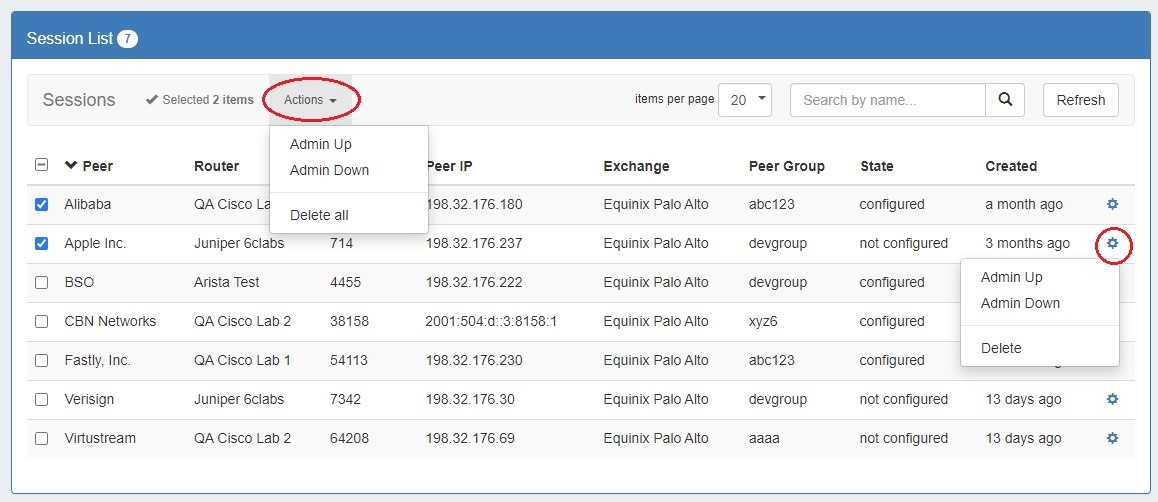 Select the session(s) and choose the desired action from the right-click menu or "Actions" dropdown menu at top. Options include Admin Up, Admin Down, and Delete.