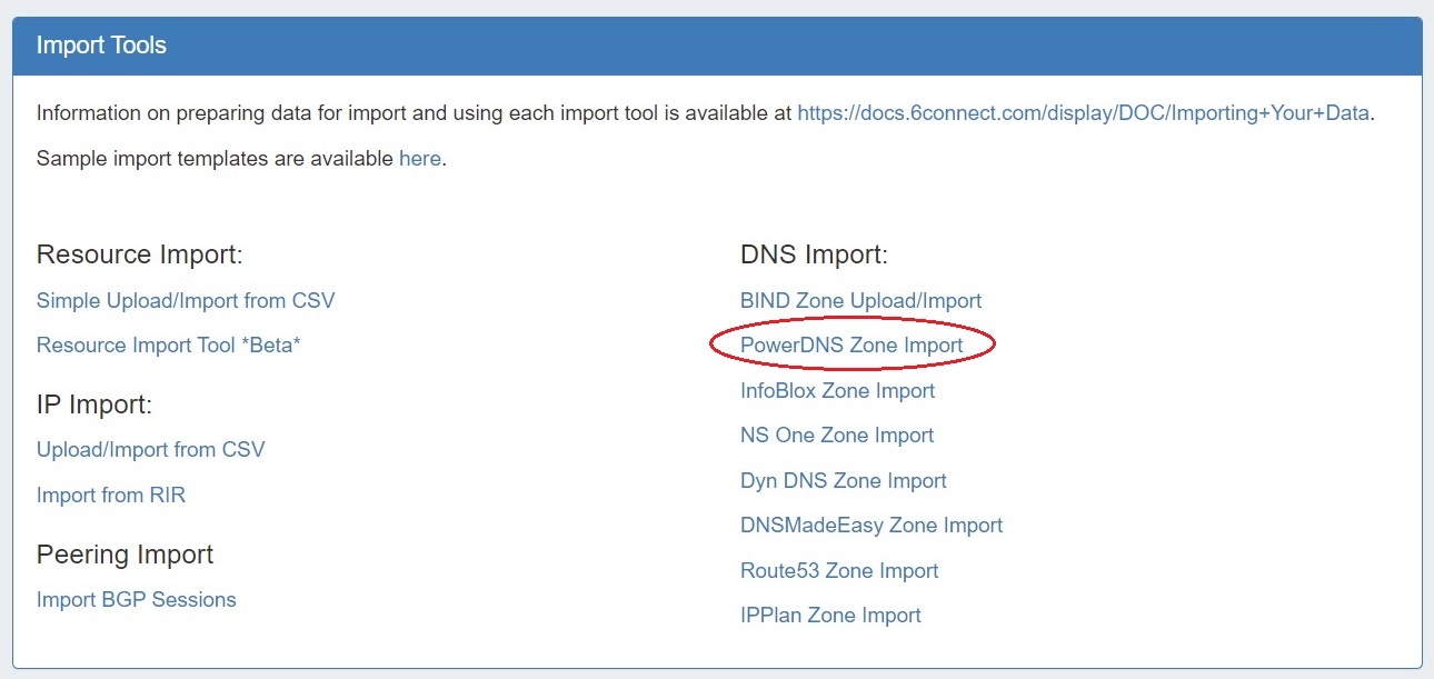 Once server setup has been verified, navigate to the Data Import Tab in the Admin section. Select the "Power DNS Zone Import" link.