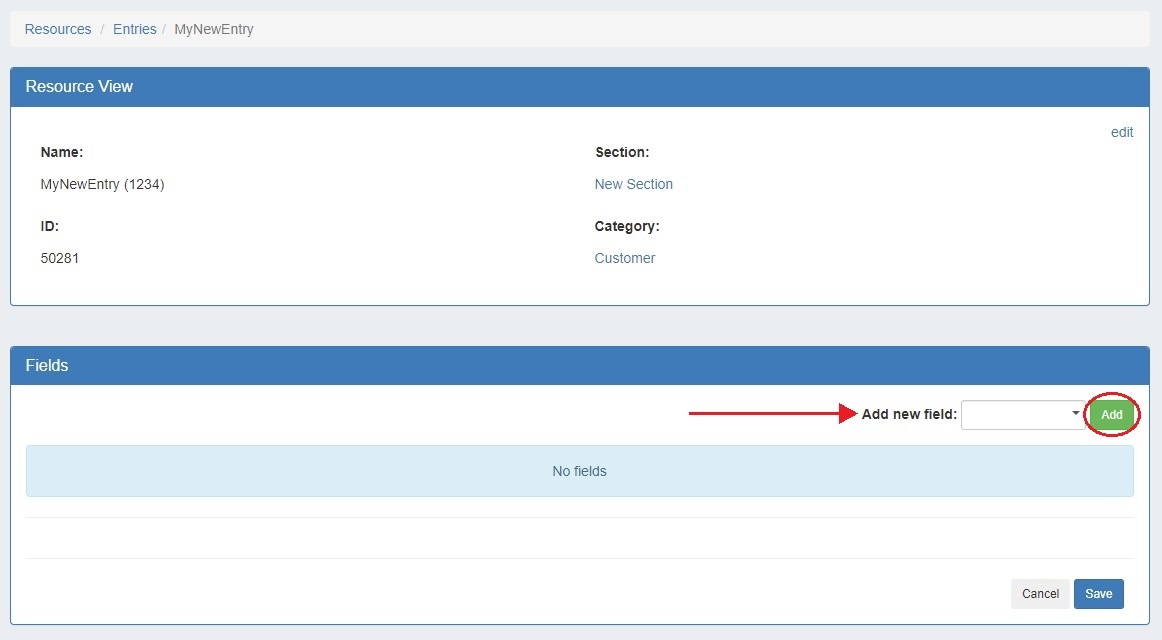 Once the Field Gadget has been added, and fields have been enabled for a section, the Field Gadget will display on the resource entry page for a resource of that section.