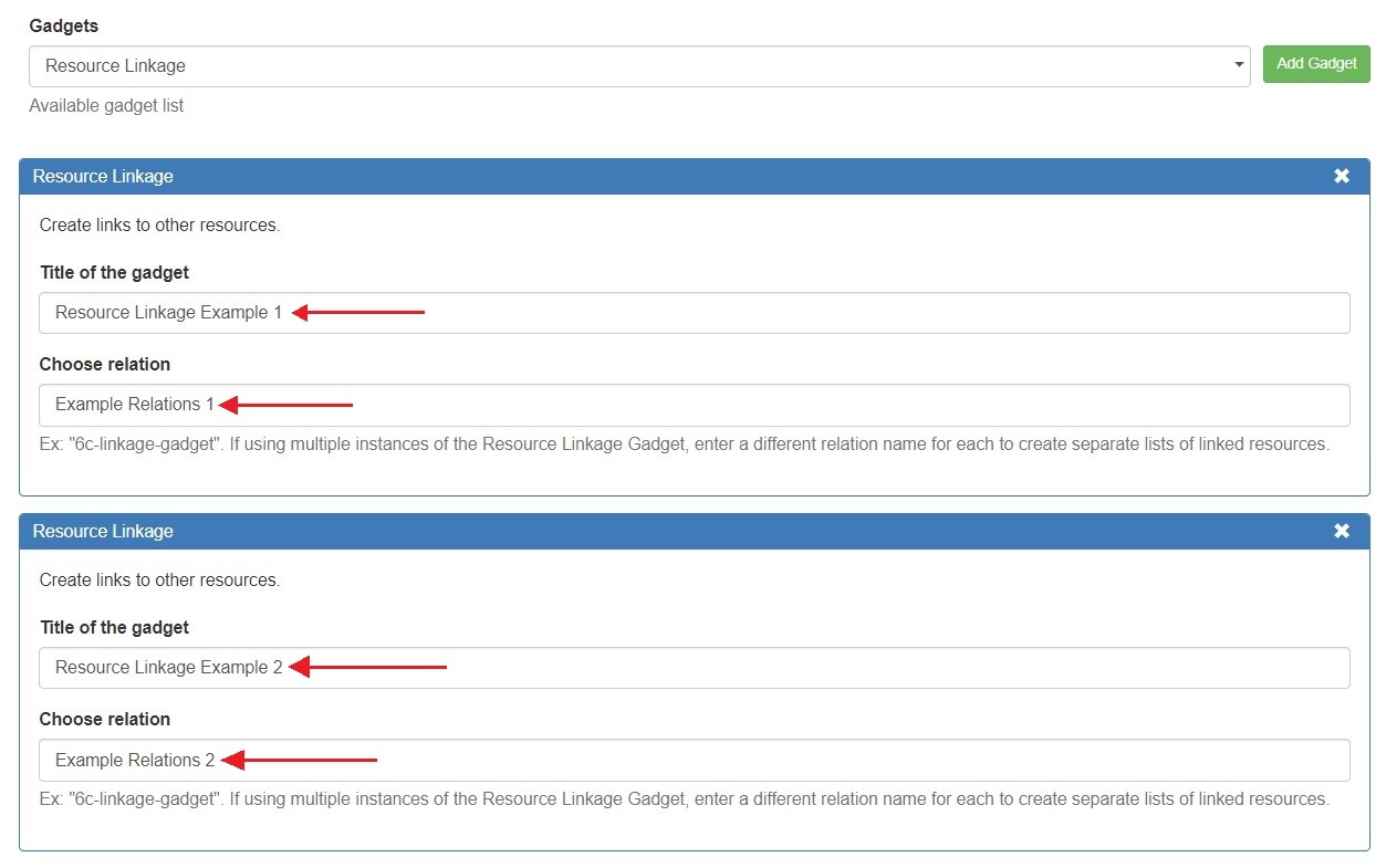 Multiple Resource Linkage gadgets can be added to a section. Use the "Choose relation" field to enter a different relation name to create separate lists of linked resources.
