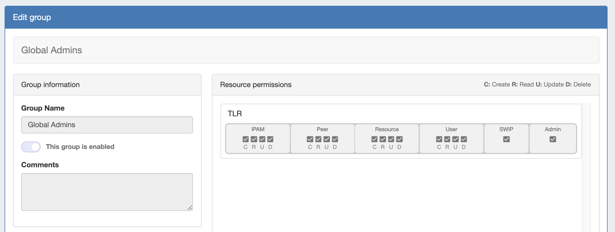 Resources & Access: Inside a Group, Resource access may be set to Global TLR (applies to all Resources), or to the specific Resource level (applies to only the selected Resources). For each Resource selected, access permissions can be set with C/R/U/D permissions under each ProVision module area (IPAM, DNS, Resource, Peering).
