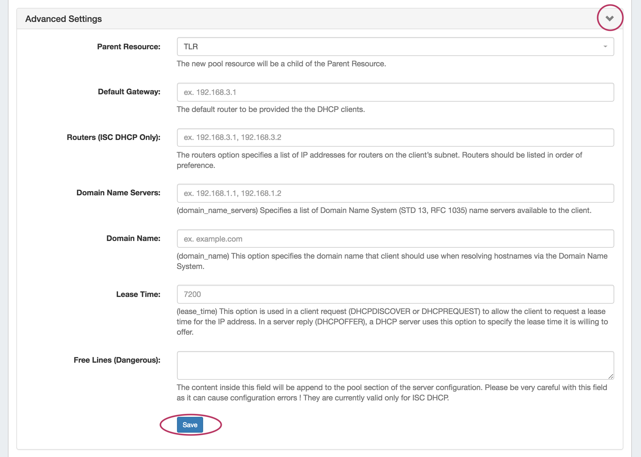 Open the zone "Advanced Settings" section by clicking on the header or the expansion arrow (>). Edit fields as needed, and click "Save" when complete.