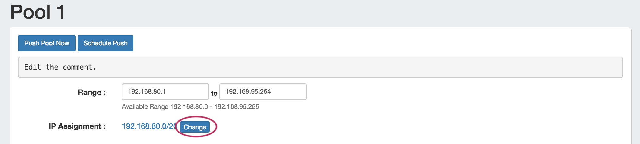 To change the current IP assignment for the pool, click the "Change" button next to "IP Assignment".