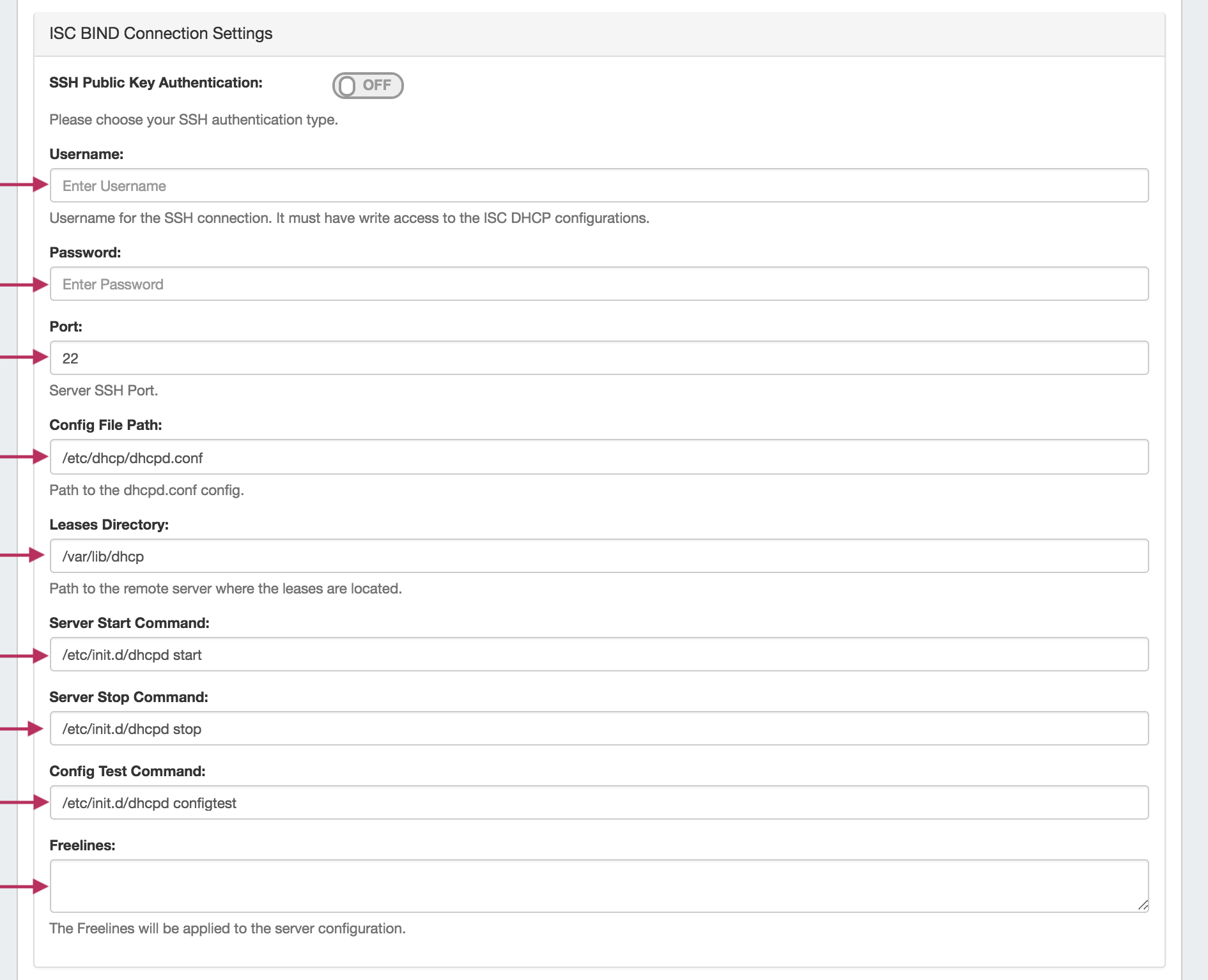 Here, we see the fields for ISC DHCP server settings. Enter the server Username, Password, Port, Leases Directory, Server Start / Stop Commands, Server Test Command and Freelines (if desired).