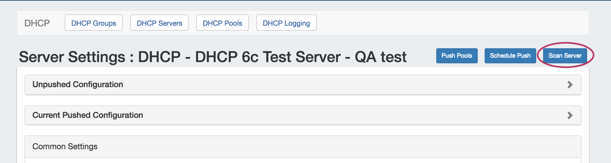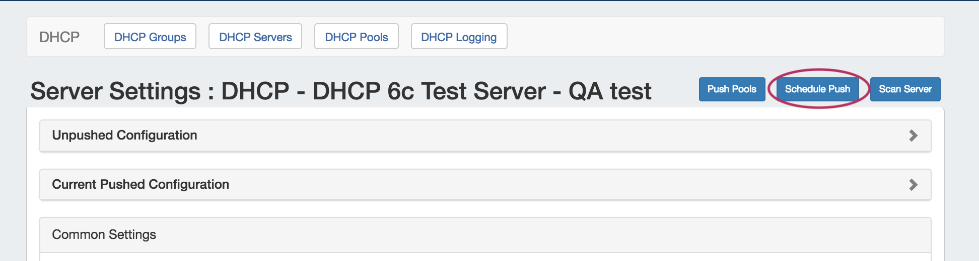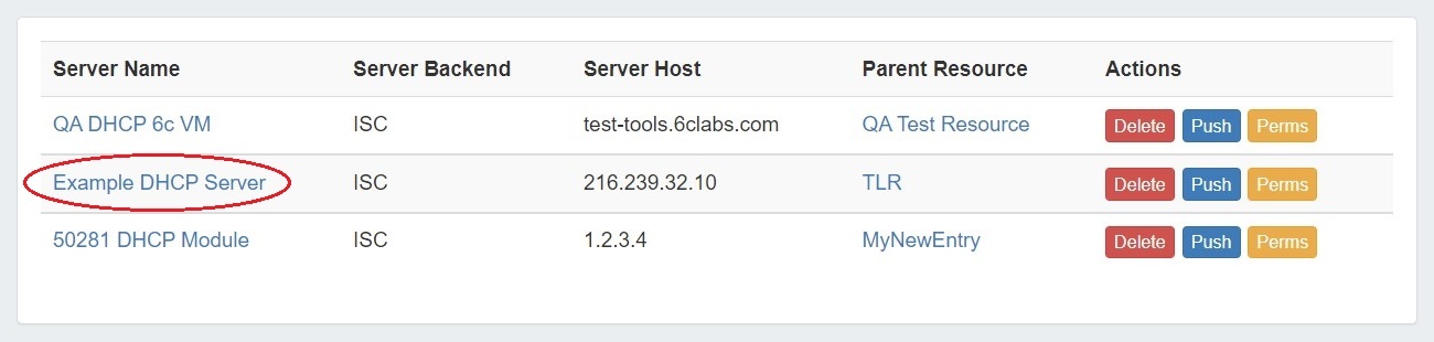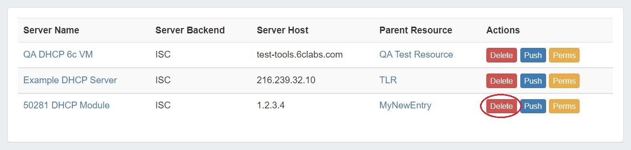 Manually pushing all pools on a server may be done directly from the DHCP Server list. Under the "Actions" section of the Server List, click the "Push" button for the desired server.