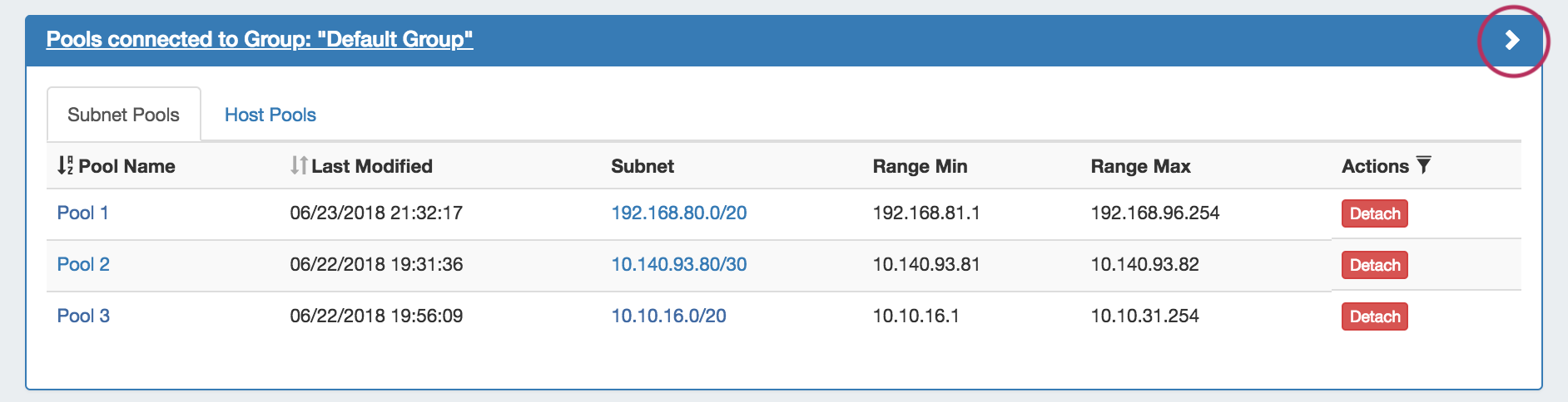Here, you may browse through subnet and host pools by selecting the appropriate tabs, sort the list by Pool Name or Last Modified, or open the Pool Details page by clicking on the name.