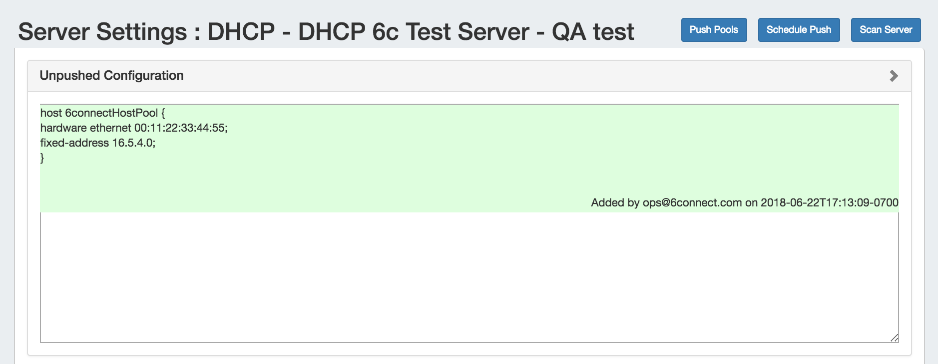 DHCP server pushes may be scheduled from either the Admin Area Scheduler Tab, or from within the DHCP Server Settings page. Scheduled pushes require Admin access.