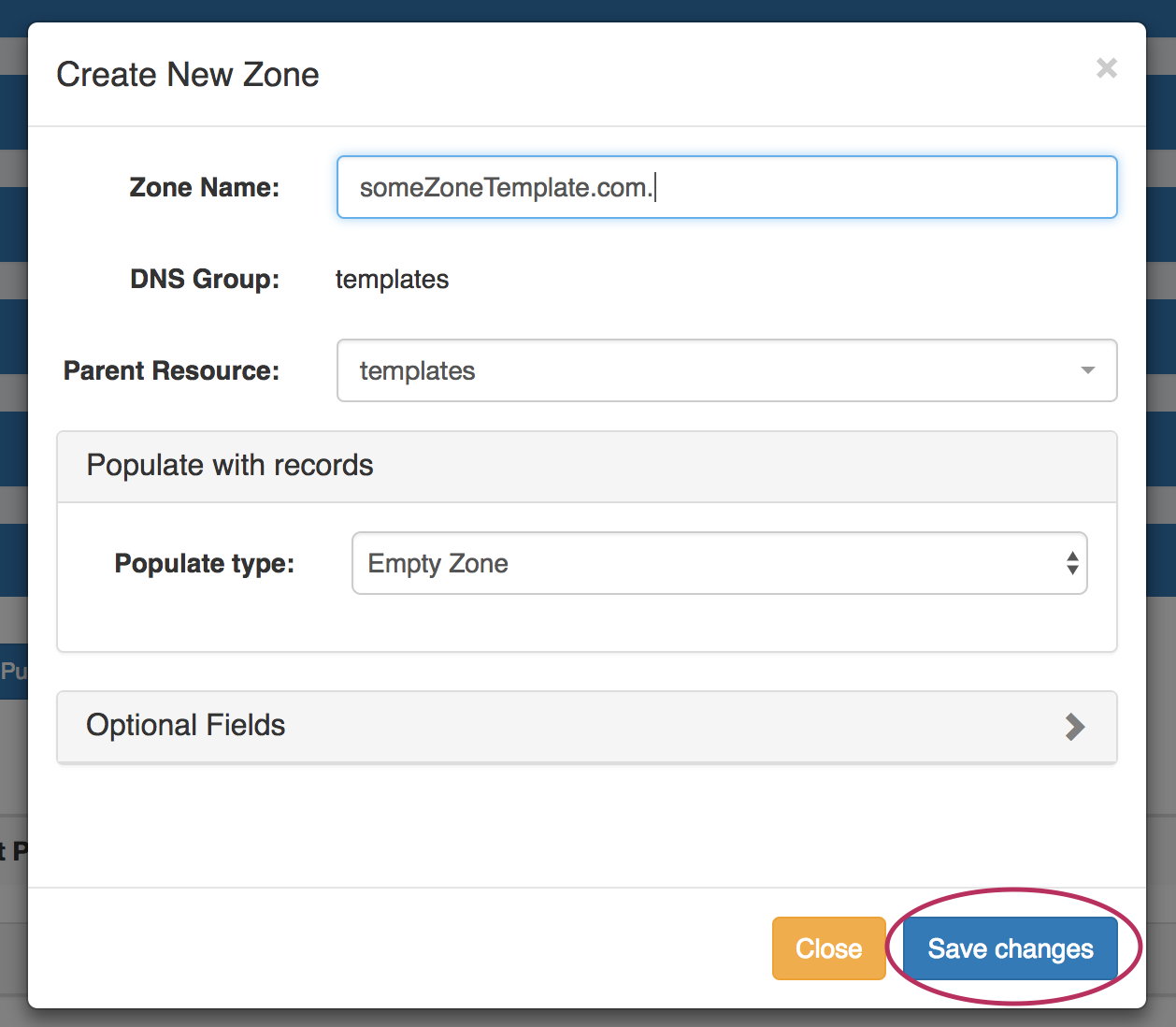 Fill in the zone name, select a parent resource (by default, the group is selected), select a populate type, and fill in any optional fields.