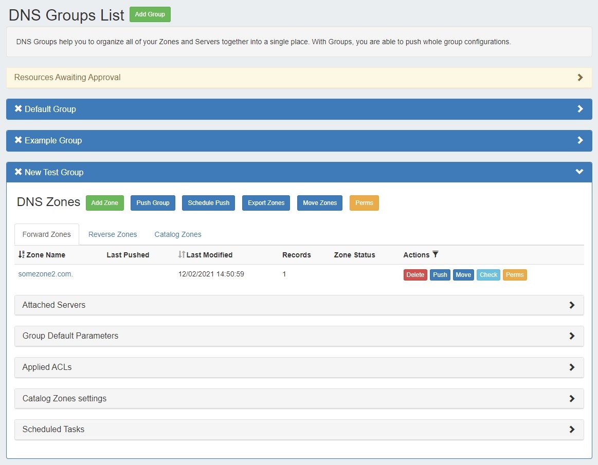 DNS groups allow for organizing multiple zones together and linking those zones with one or more servers. Default nameservers, SOA values, and ACL's are set at the group level, so different groups may have their own default values. Zones may be pushed individually, as a group, or at the server level.