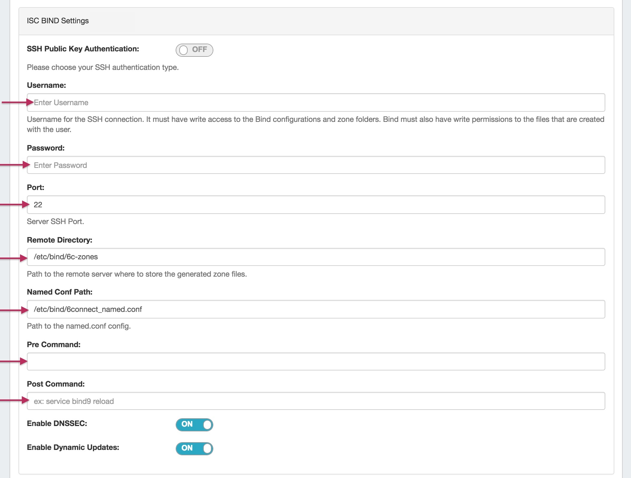 Here, we see the fields for ISC BIND server settings. Enter the server Username, Password, Port, Remote Director, Named Conf. Path, and Pre/Post Command (if desired). Your fields may vary for other server types.