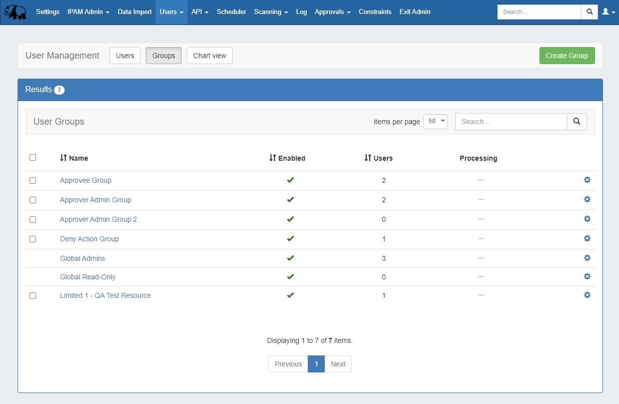 Processing: While group edits are being processed, an indicator will show under the processing column until changes have been propagated throughout the instance