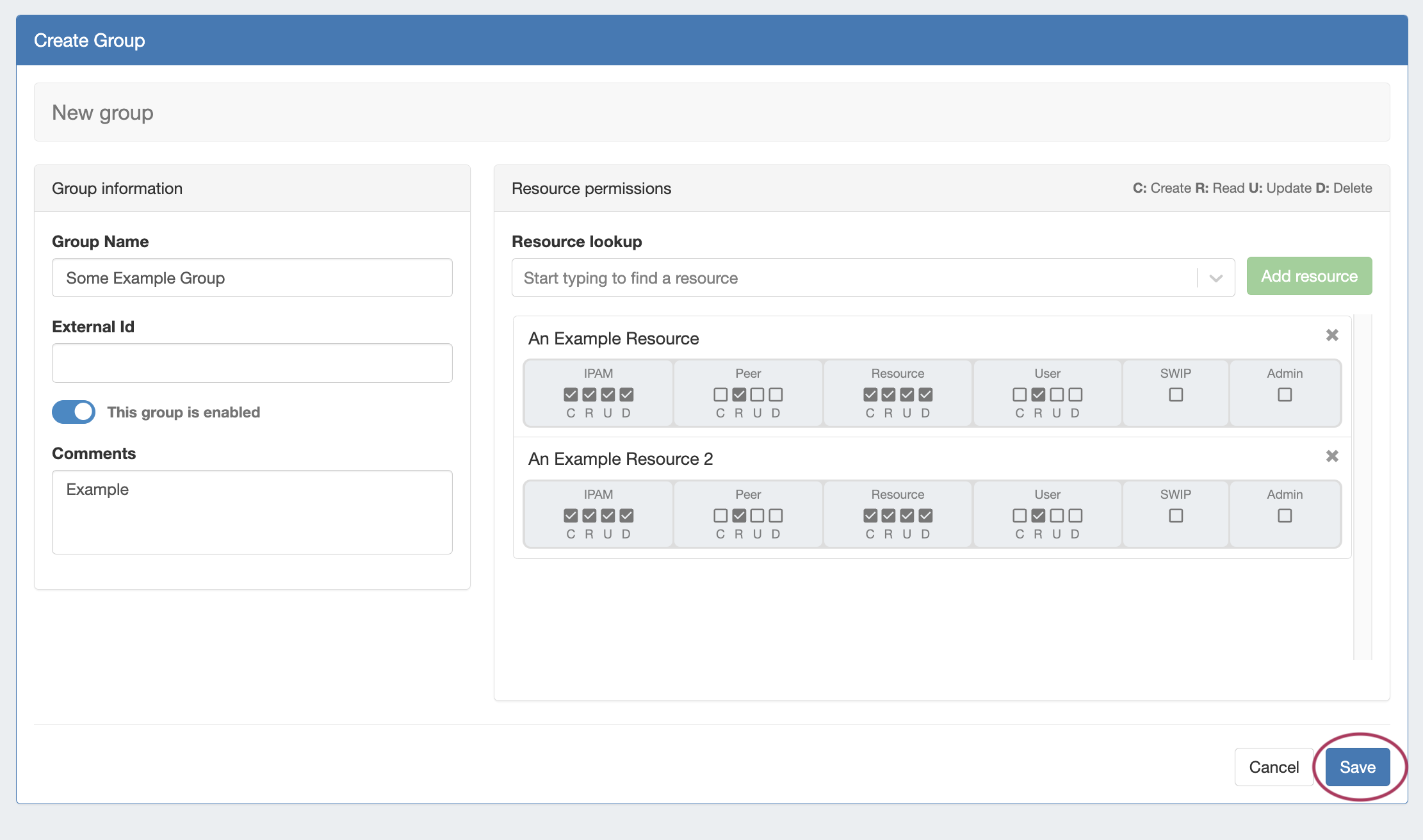 In the example below, we make a group called "Some Example Group", whose users we want to be able to access two resources: An Example Resource, and An Example Resource 2.
