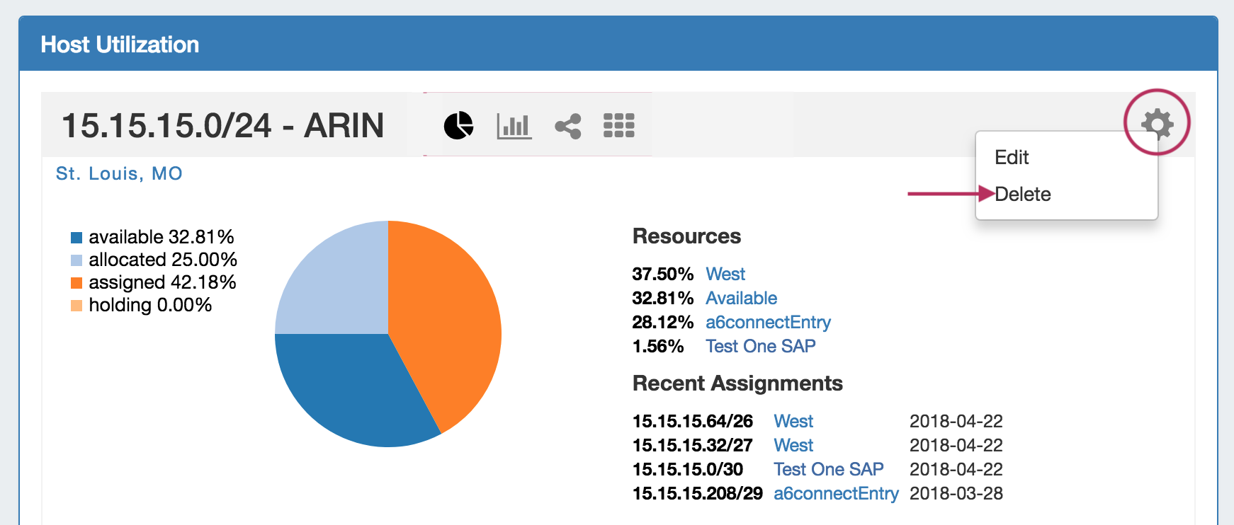 Aggregates may be deleted from the Gear Icon in the top right corner of their Host Utilization box display.