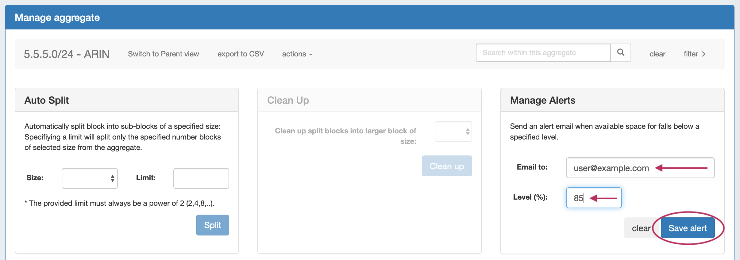 Open up aggregate level actions in IPAM Manage by clicking on the "Actions" link in the Manage Aggregate header.