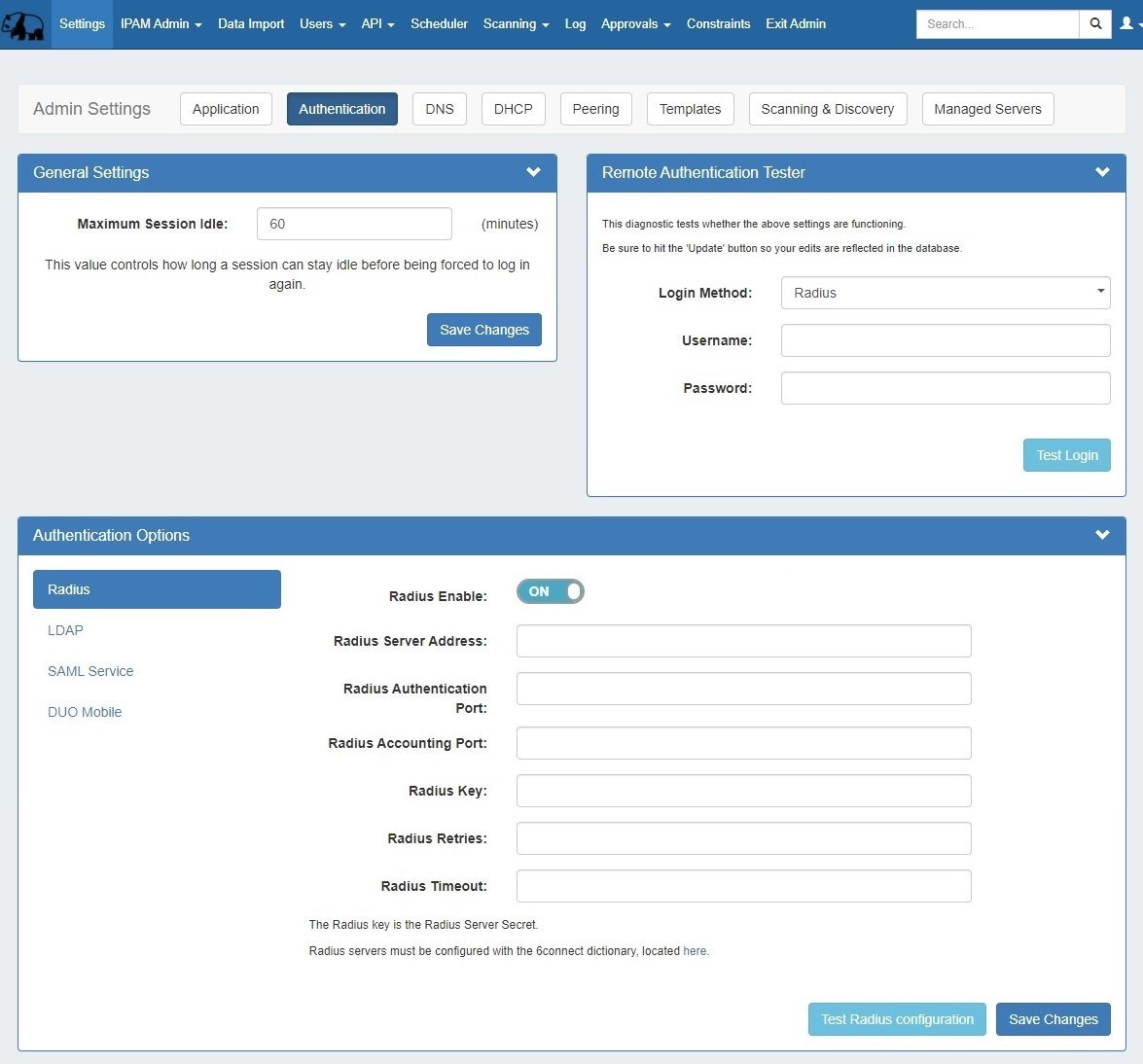 In this area, you may set the max session idle time, as well as setup additional authentication options. Four non-local authentication types are available for ProVision: Radius, LDAP, SAML, and DUO Mobile.