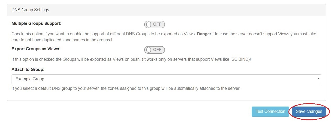In the last section, select whether to enable support for exporting DNS Groups as Views (click to toggle ON / OFF), and select a default Group, if desired, to be associated with the server. Zones assigned to the selected Group will automatically be attached to the server.