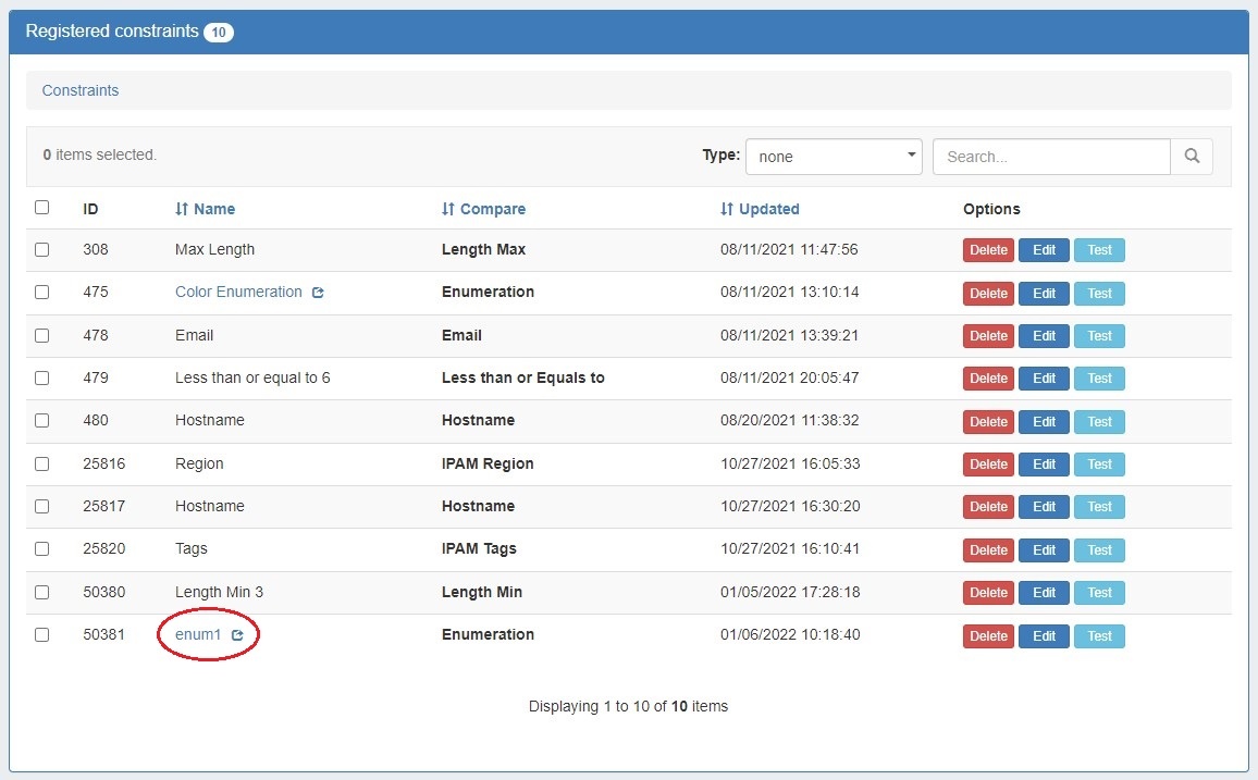 From here, navigate back up to the parent constraint list that displays "enum1", and click "Test" (test will not work on individual child constraint items)