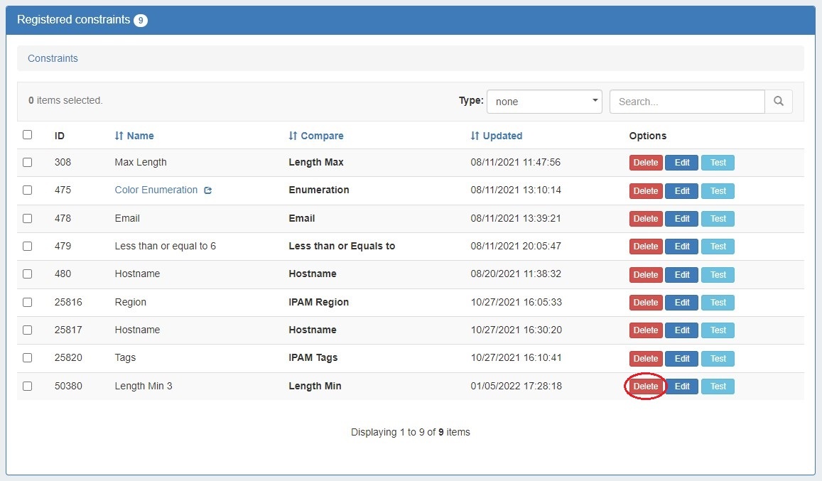The Constraints Tab, available to Admin users, allows for custom field validation and field restrictions to be applied to IPAM fields. The applied constraint may be anything from a numerical comparison operation,  a check against a pre-determined text string, ensuring selections from a pre-set list, or forcing entries into a specific format, such as IPv4/IPv6, phone number, or RegEx.