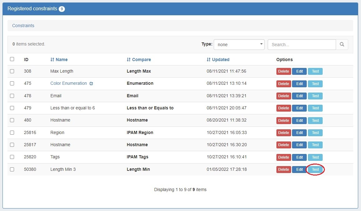 The Constraints system allows Admin users to configure custom field validation and limitations into IPAM fields. Many constraint types are available, such as mathematical comparison operators, length, enumeration, pre-set lists, RegEx, IPv4/IPv6, Phone, email, hostname, FQDN, Mac Address, and URL.