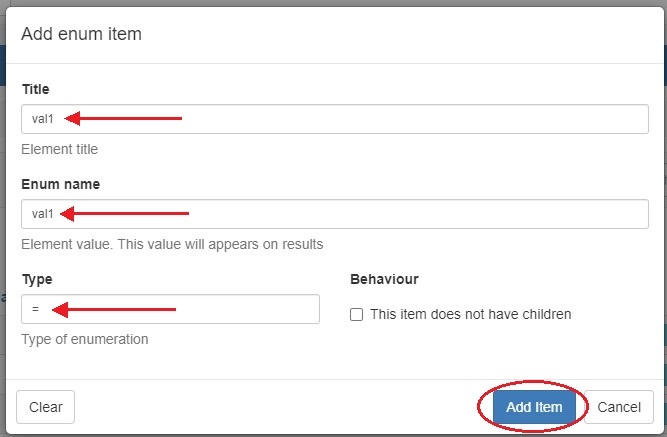 Add a new child enum item by entering a title, name/value, and the type. Typically, the type will be "=", for "equals this value".