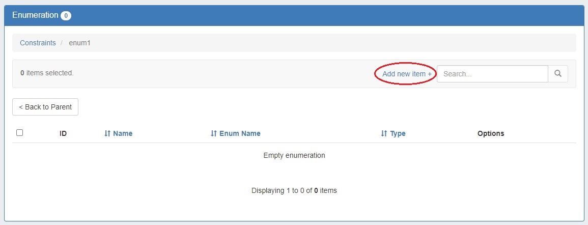 For Enumeration, click "Add New Item", If using All of or One of types, then you will need to click "Add Constraint" to add child constraint items.