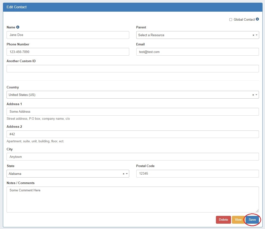 Fill in the contact's information for Name, Parent Resource (if desired), Phone, Custom ID, Email, Address, and Comments if desired.