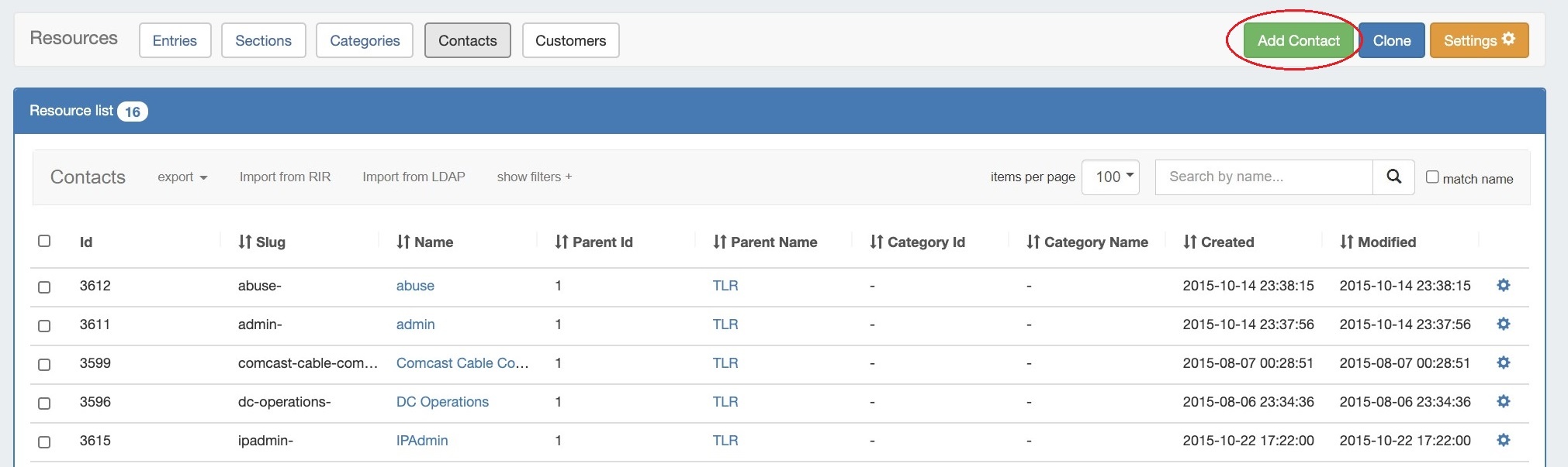 Then, from the Resource Tab → Contacts List, click the "Import from LDAP" button at the top of the list.